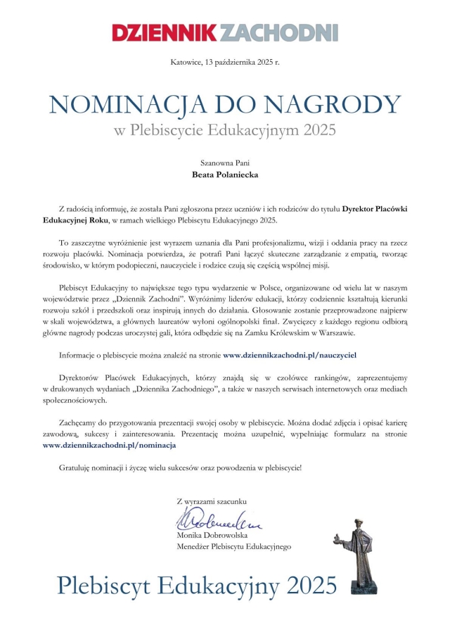 Bardzo dziękujemy za nominację w plebiscytach „Szkoła roku” oraz „Dyrektor placówki edukacyjnej roku”. Na pewno jest to wyraz doceniania naszej codziennej pracy. Już sama nominacja jest wyróżnieniem i powodem do dumy. I to nam w zupełności wystarczy:) Nie ma potrzeby oddawania na nas głosów.