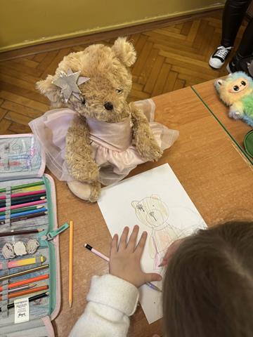 Od samego rana pierwszakom towarzyszyli ich ukochani pluszowi przyjaciele. Dzieci poznały krótką historię święta, opowiadały o swoich misiach oraz z zaangażowaniem tworzyły własne misiowe rysunki.