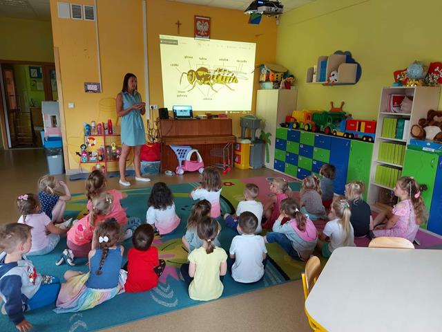 na początku porozmawialiśmy o tym, jak wygląda pszczoła, co robi i gdzie mieszka. Dzieci mogły się również dowiedzieć, co to jest pasieka, czym zajmuje się pszczelarz i jak powstaje miód